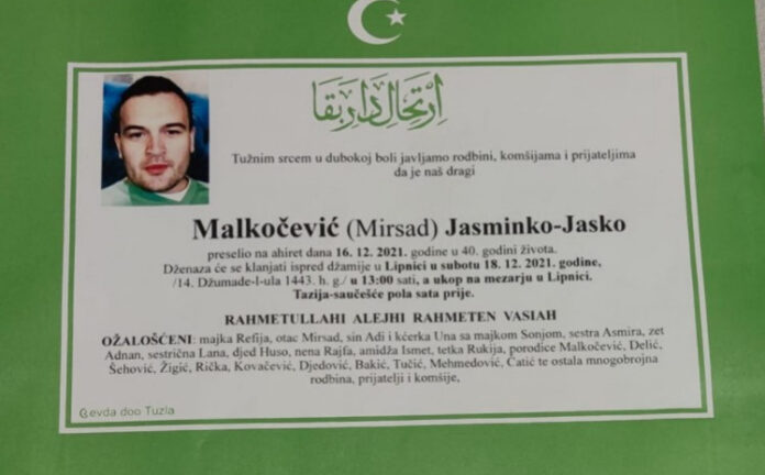 Dženaza pjevaču Jasminu Malkočeviću iz Tuzle bit će obavljena sutra u 13 sati ispred džamije u mjestu Lipnica kod Tuzle.
