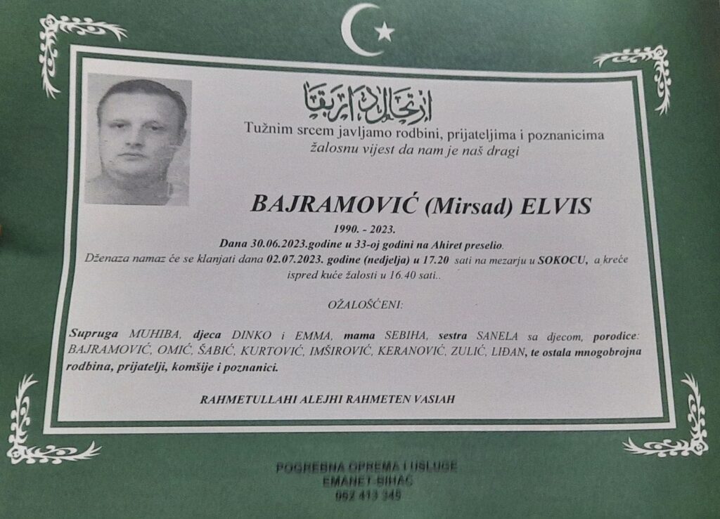 Dženaza ubijenom Elvisu Bajramoviću klanjat će se sutra 2. jula u 17:20 sati na mezarju u Sokocu, a kreće ispred kuće žalosti u 16.40 sati.