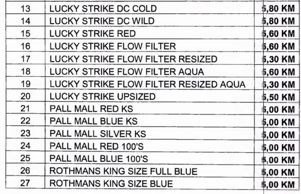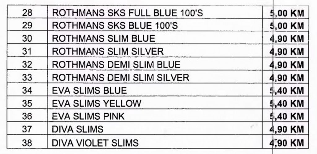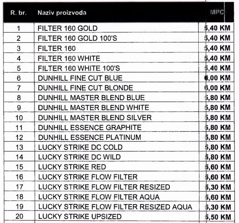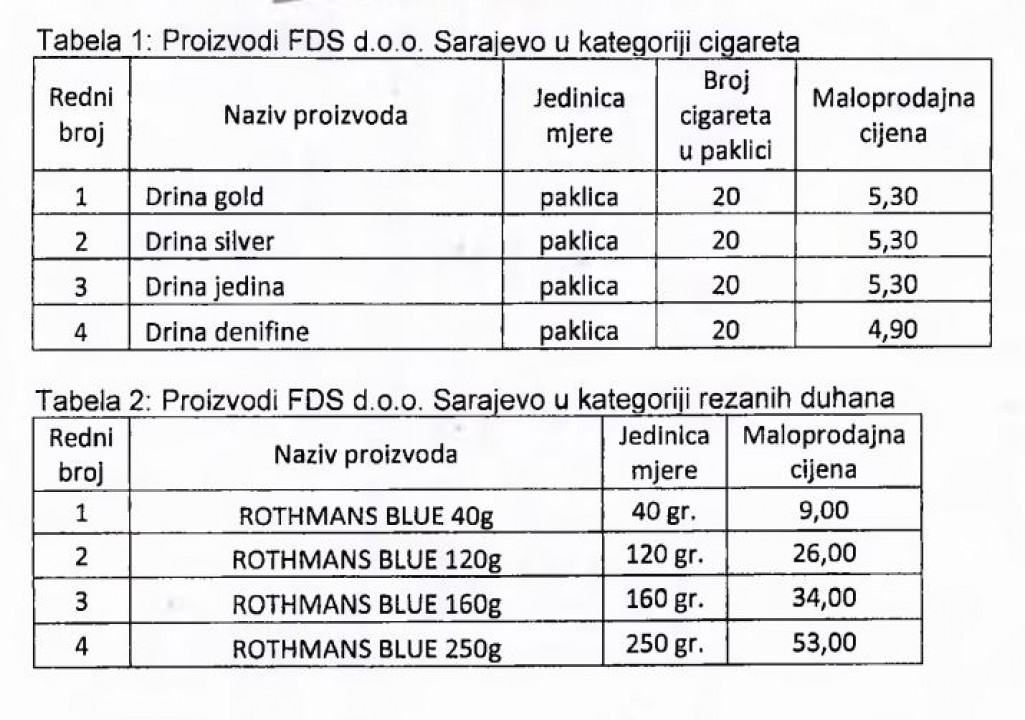 – specifična akciza u iznosu od 82,50 KM za 1.000 komada, odnosno 1,65 KM za pakiranje od 20 komada.