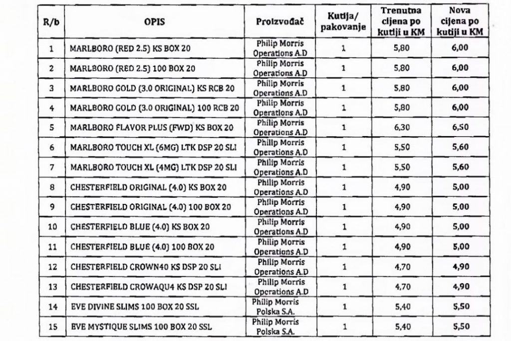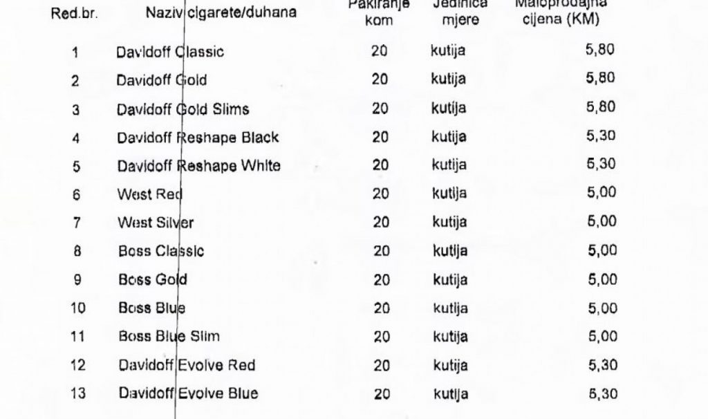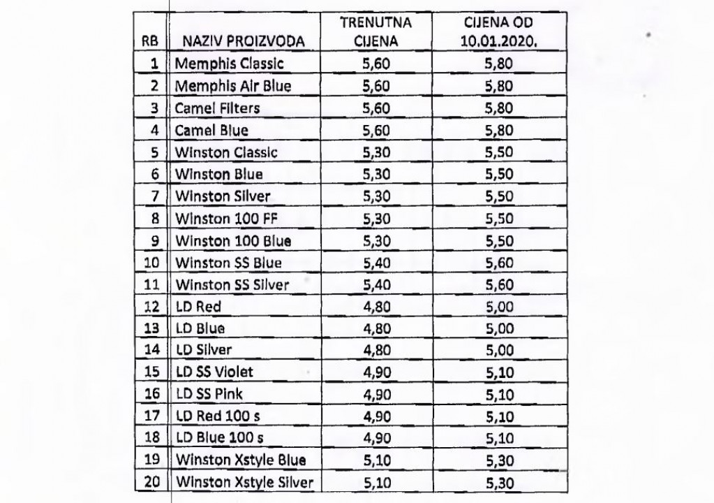 Od 1. januara poskupljuju cigarete. Kako je potvrđeno iz Uprave za indirektno oporezivanje BiH, pojedine cigarete u narednoj godini ostat će na istom nivou kao i u toku 2019., dok će pojedine poskupiti za 0,10 do 0,30 KM po paklici cigareta.