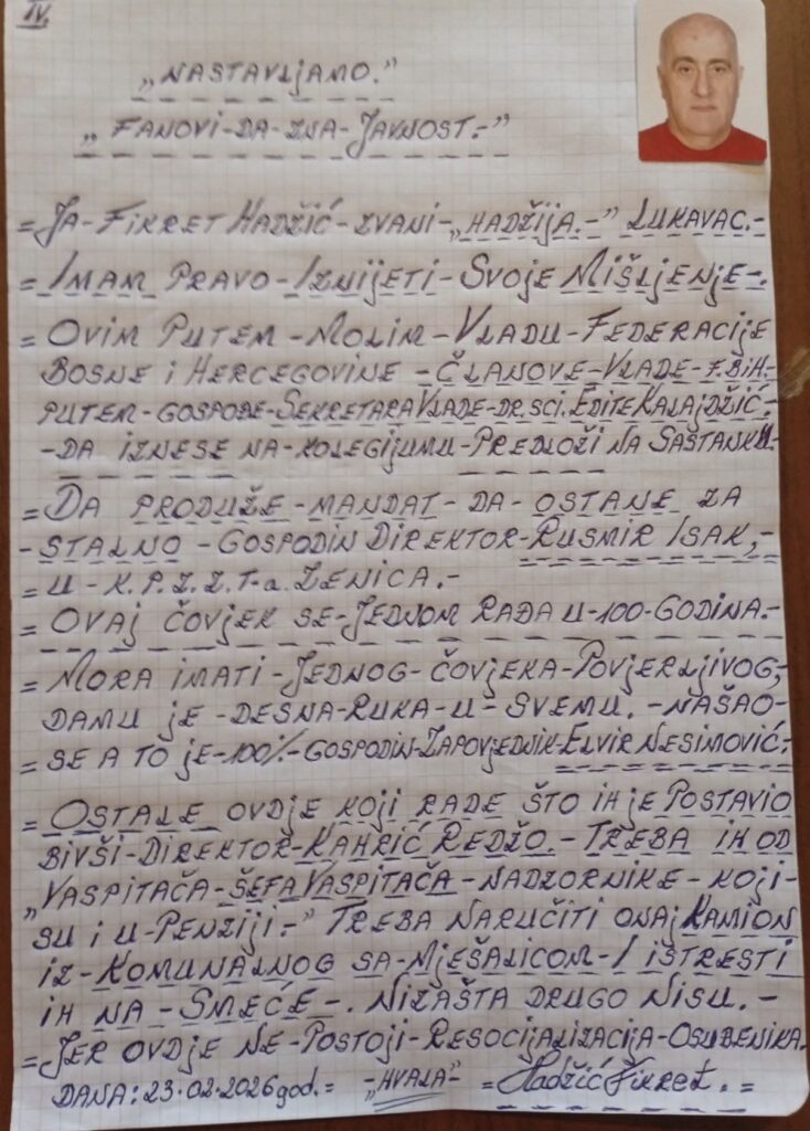 U rukom pisanom pismu, potpisanom imenom Fikret Hadžić – zvani „Hadžija“ – autor se direktno obraća Vladi Federacije Bosne i Hercegovine i članovima Vlade FBiH, putem sekretara, tražeći da se na kolegiju razmotri prijedlog produženja mandata direktoru KPZ Zenica, Rusmiru Isaku.