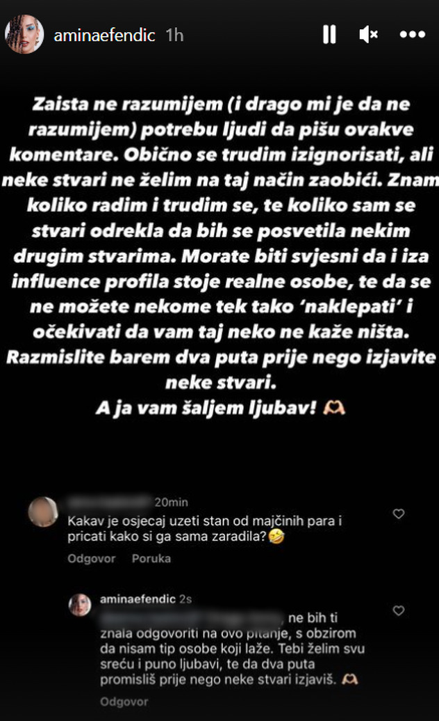 “Zaista ne razumijem (i drago mi je da ne razumijem) potrebu ljudi da pišu ovakve komentare. Obično se trudim izignorisati, ali neke stvari ne želim na taj način zaobići. Znam koliko radim i trudim se te koliko sam se stvari odrekla da bih se posvetila nekim drugim stvarima. Morate biti svjesni i da iza influence profila stoje realne osobe te da se ne možete nekom tek tako ‘naklepati’ i očekivati da vam taj neko ne kaže ništa. Razmislite barem dva puta prije nego izjavite neke stvari, a ja vam šaljem ljubav”, poručila je Amina.