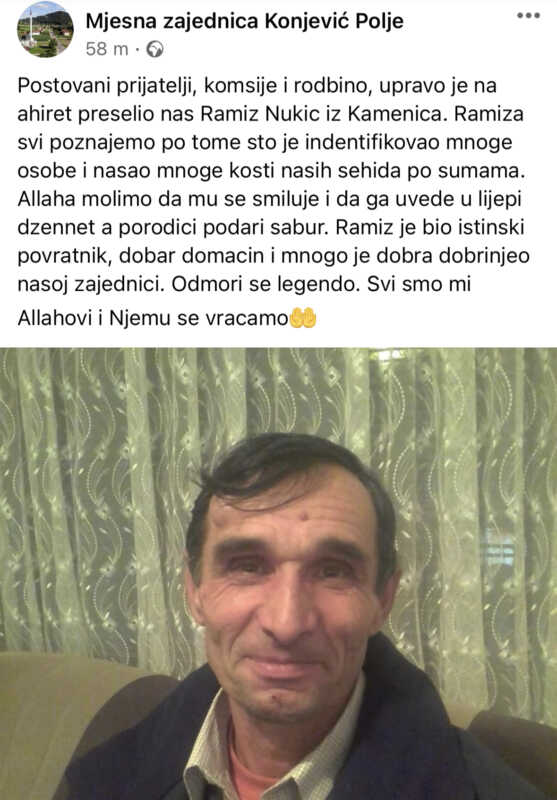 Ramiz Nukić iz Kamenice, poznat po sakupljanju kostiju ubijenih Bošnjaka, žrtava genocida u Srebrenici, preminuo je danas.