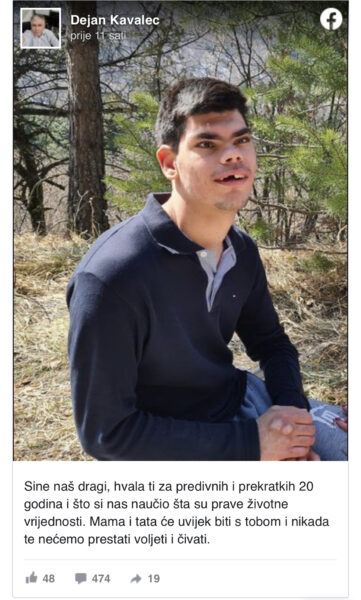 “Sine naš dragi, hvala ti za predivnih i prekratkih 20 godina i što si nas naučio šta su prave životne vrijednosti. Mama i tata će uvijek biti s tobom i nikada te nećemo prestati voljeti i čuvati”, napisao je Dejan uz Denisovu fotografiju na kojoj je imao prepoznatljiv osmijeh kojeg nikada nije skidao s lica i njime uvijek plijenio sve one koji su ga ikada sreli.
