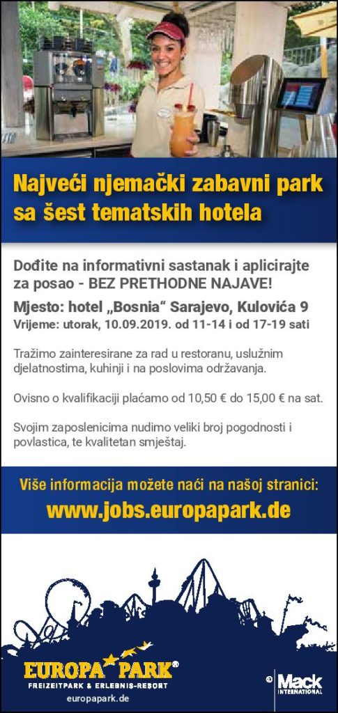 Najveći njemački zabavni park ‘Europa Park’ traži nove zaposlenike, a informativni sastanci za sve zainteresovane kandidate će se održati u Sarajevu 10. septembra u terminima od 11 do 14 te od 17 do 19 sati i to u hotelu Bosnia na adresi Kulovića 9 u Sarajevu.