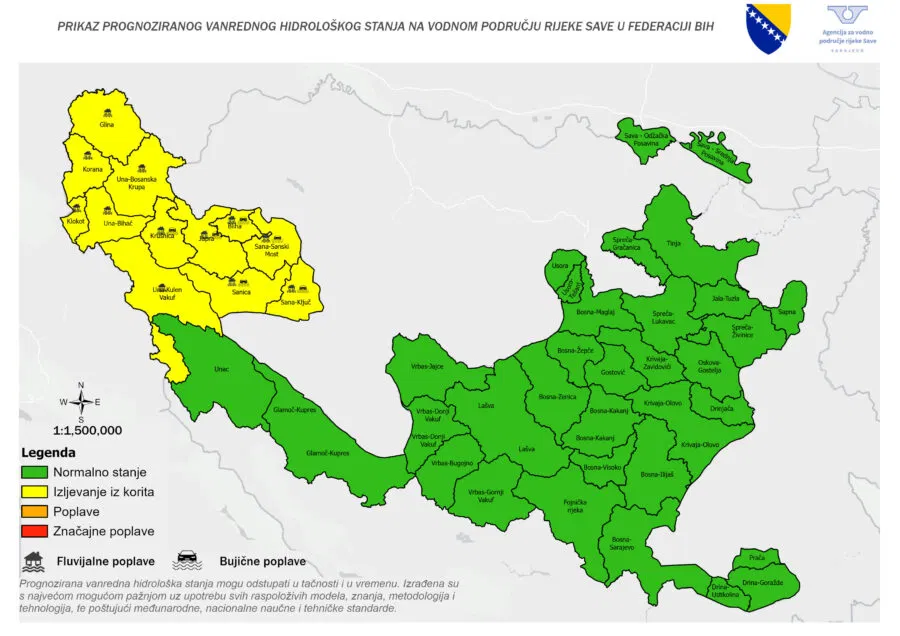“Obavještenje o prognozi vanrednog hidrološkog stanja odnosi se na područje Unsko-sanskog kantona, odnosno područje gradova/općina: Bihać, Bosanska Krupa, Sanski Most i Ključ”, ističe se.