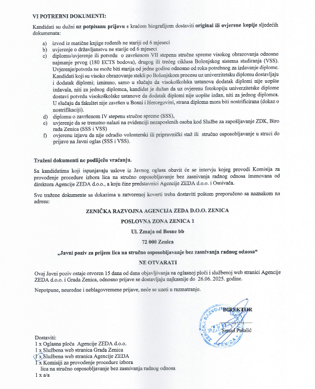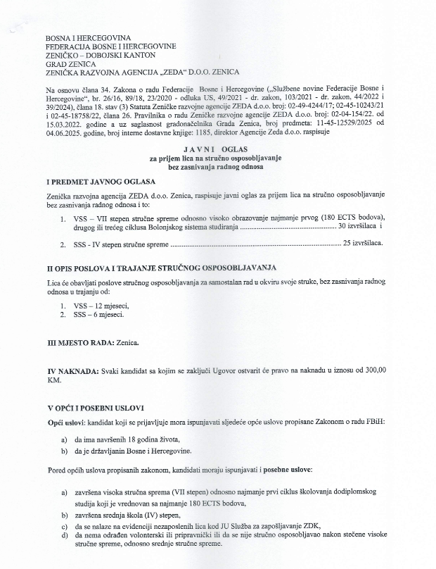 Zenička razvojna agencija ZEDA d.o.o. Zenica raspisala je javni oglas za prijem ukupno 55 osoba na stručno osposobljavanje bez zasnivanja radnog odnosa.