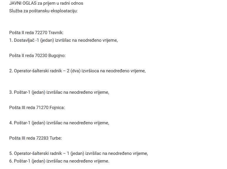 JAVNI OGLAS za prijem u radni odnos Služba za poštansku eksplotaciju.