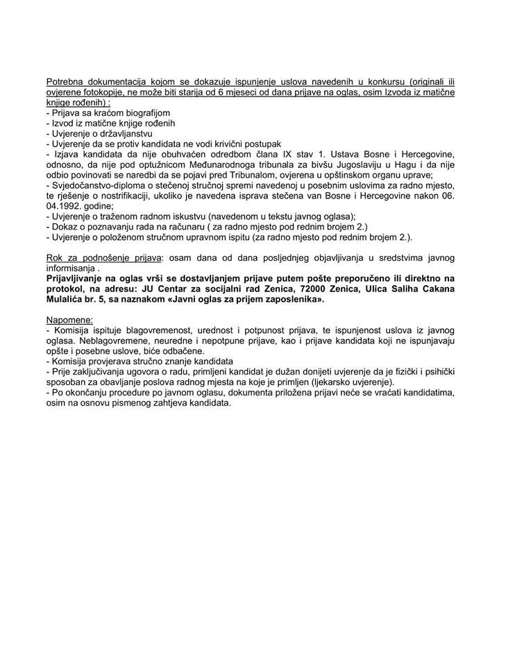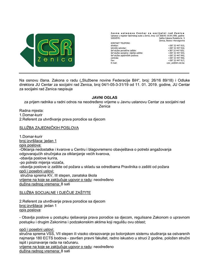 JU Centar za socijalni rad Zenica: Javni oglas za prijem radnika u radni odnos na neodređeno vrijeme
