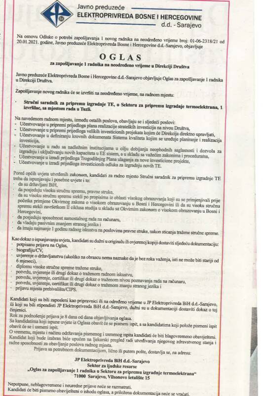 Javni konkurs za zapošljavanje radnika u JP Elektropriveda BiH, objavljen u Oslobođenju 11.03.2021. godine.