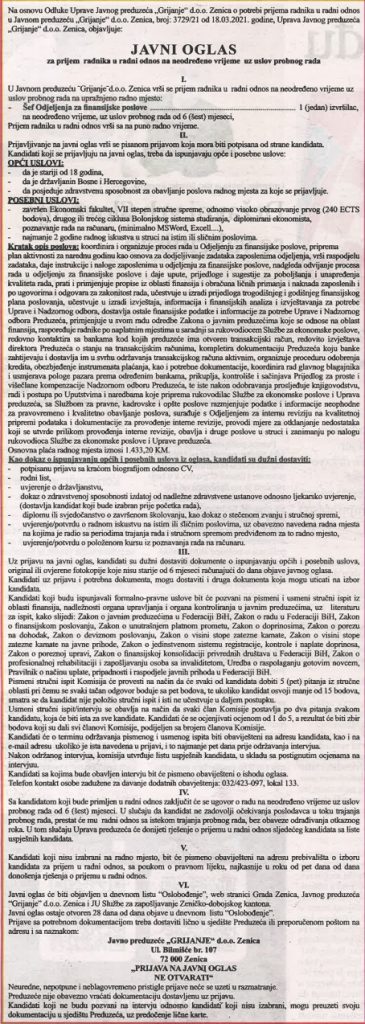 Javni oglas za prijem radnika u JP “Grijanje” Zenica, objavljen u Oslobođenju 20. 3. 2021. godine.