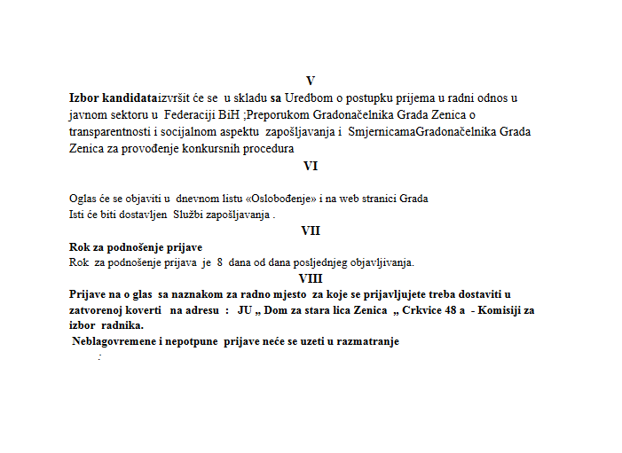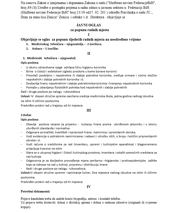 JU “Dom za stara lica Zenica”: Javni oglas za popunu radnih mjesta na neodređeno vrijeme