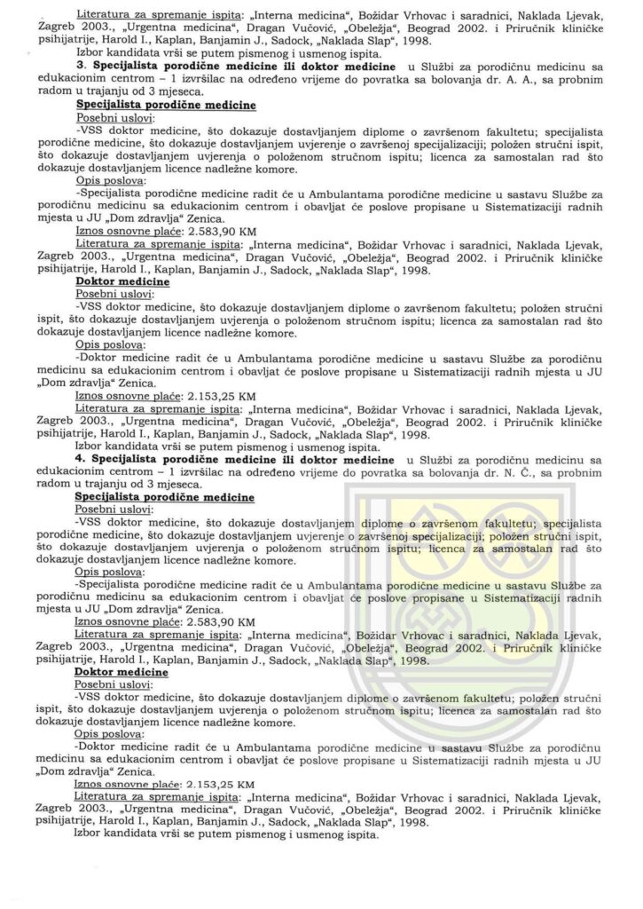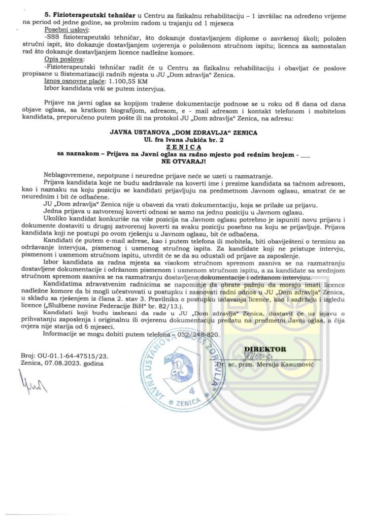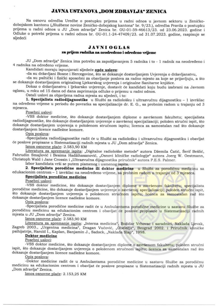 Na osnovu odredba Uredbe o postupku prijema u radni odnos u javnom sektoru u Zeničko- dobojskom kantonu („Službene novine Zeničko-dobojskog kantona” br. 9/23.), odredba Pravila o postupku prijema u radni odnos u JU „Dom zdravlja” Zenica br. OU-01-59-46613/23. od 23.06.2023. godine i Odluke o potrebi prijema u radni odnos br. OU-01.1-24-47409/23. od 31.07.2023. godine, raspisuje se sljedeći