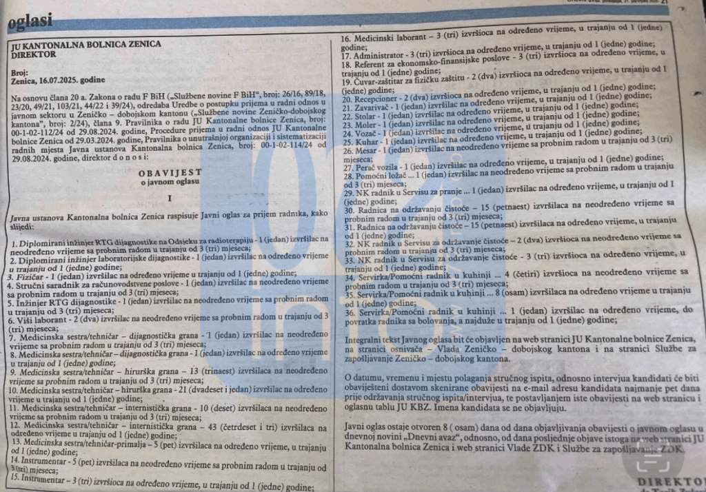 U vremenu kada mnogi građani tragaju za sigurnim zaposlenjem, iz Zenice dolaze odlične vijesti! Kantonalna bolnica Zenica raspisala je javni oglas za prijem čak 179 novih radnika, i to u najrazličitijim profilima – od visokoobrazovanih stručnjaka do pomoćnog osoblja, piše 072info!
