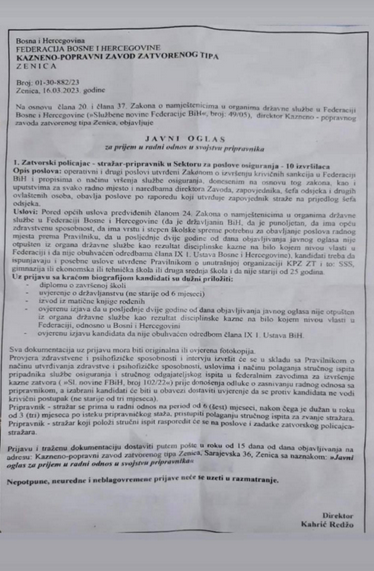 Na osnovu člana 20. i člana 37, Zakona o namještenicima u organima državne službe u Federaciji Bosne i Hercegovine (“Službene novine Federacije BiH”, broj: 49/05), direktor Kazneno – popravnog zavoda zatvorenog tipa Zenica, objavljuje
