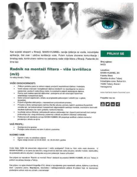 MANN HUMMEL BA d.d. Tešanj zapošljava radnike na montaži filtera.