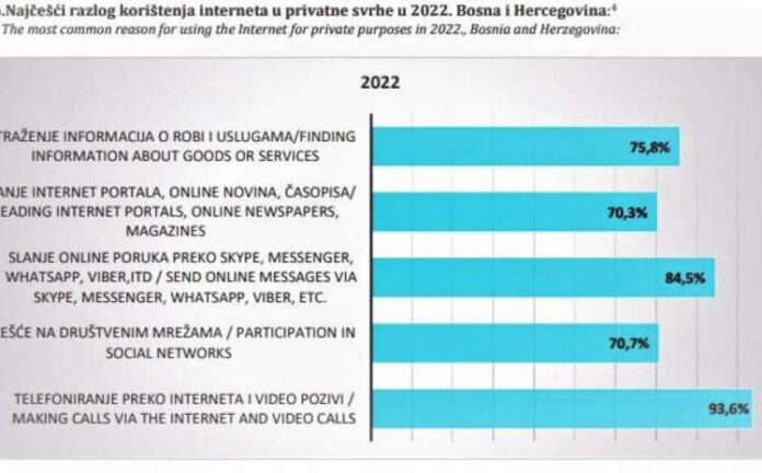 Najčešći razlozi korištenja interneta u privatne svrhe u 2022. godini u Bosni i Hercegovini su: traženje informacija o robama i uslugama 75,8 posto; čitanje internet portala, online novina i časopisa 70,3 posto; slanje online poruka putem skypea, messengera, whatsappa, vibera itd. 84,5; učešće na društvenim mrežama 70,7 posto te telefoniranje putem interneta 93,6 posto.