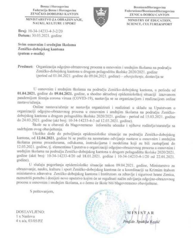 Zbog još uvijek nepovoljne epidemiološke situacije produženo je trajanje online nastave u osnovnim i srednjim škola u Zeničko-dobojskom kantonu.