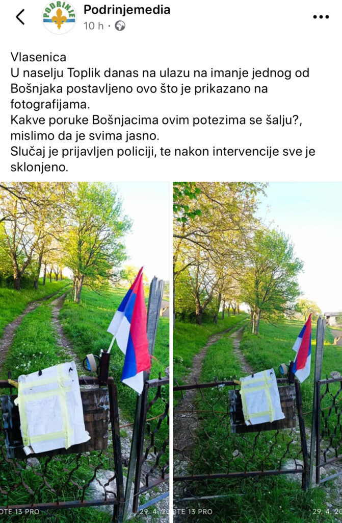 U naselju Toplik, kod Vlasenice, danas se dogodila provokacija. Na imanju u vlasništvu jednog Bošnjaka nepoznata osoba, ili više njih, na ogradi je ostavila okačenu zastavicu srpske trobojke sa porukom.