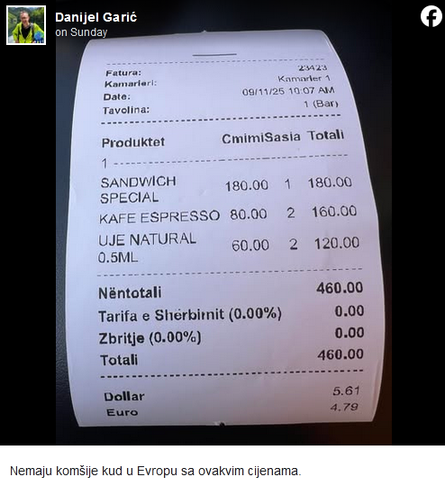 – 460 albanskih leka je 4,76 eura – i to za sendvič specijal, dva espressa i dvije vode. U mom gradu samo dvije vode su pet eura!