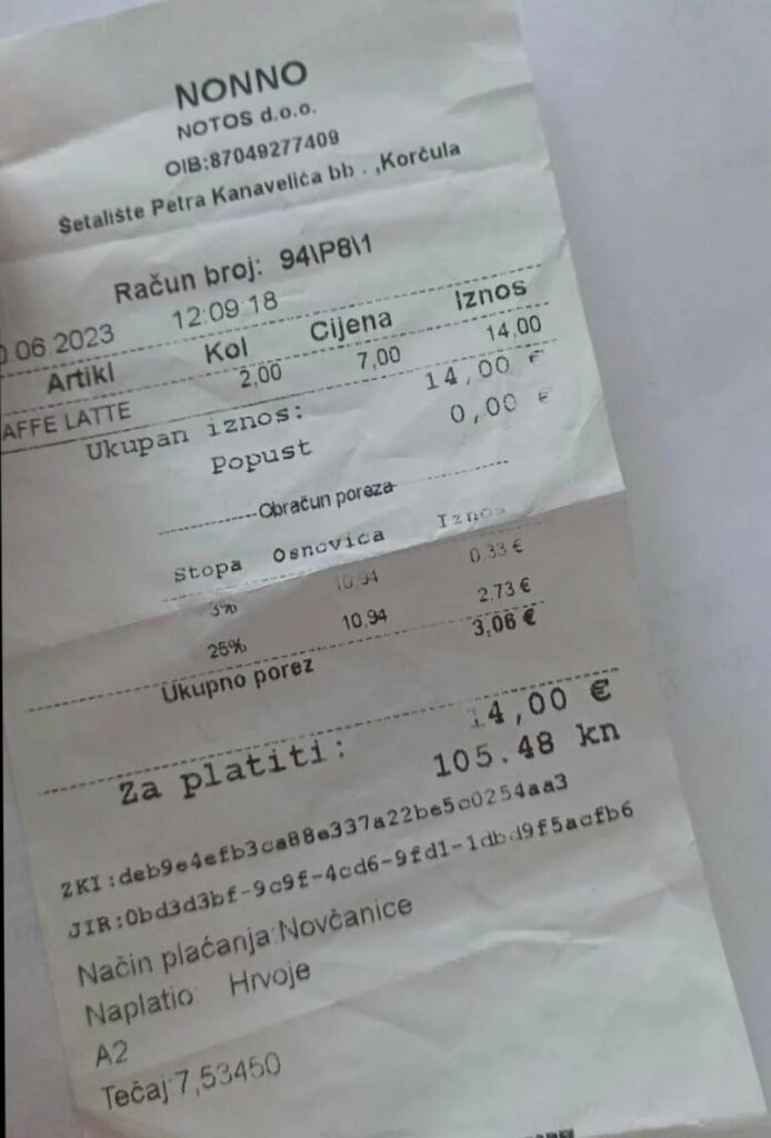 Kako bilo, najnoviji primjer pozamašnog iznosa na računu poslao je čitatelj koji je u središtu Korčule platio dvije kafe s mlijekom.