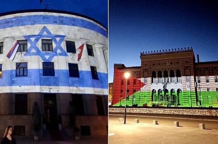 No ne misle svi ovako. Palata RS u bojama Izraela kao znak podrške Izraelu i njihovom nastojanju da uspostave mir na bliskom istoku, kažu u kabinetu Željke Cvijanović. Ista poruka poslana i sa zidina starog grada u Trebinju. Vijećnica u Sarajevu, s druge strane, u bojama Palestine, u znak solidarnosti sa svim nevinim žrtvama i njihovim porodicama” , navedeno je je na Twitteru gradonačelnice Sarajeva Benjamine Karić. Zastava Palestine i na Starom mostu u Mostaru.