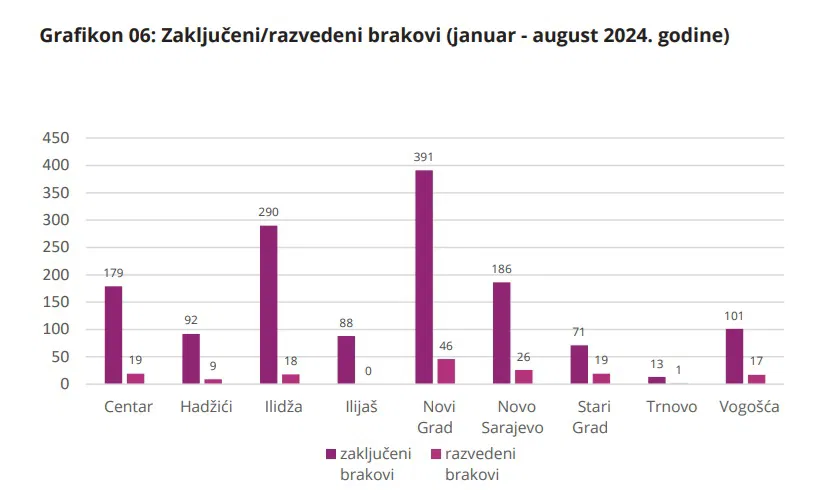 U Novom Sarajevu ovaj omjer je 186 prema 26, a u Centru 197 prema 19. Na sklapanje braka u Vogošći, zaključno sa augustom 2024. godine, odlučio se 101 par, a 17 je izabralo razvod. U Hadžićima su bila 92 vjenčanja i devet razvoda, Starom Gradu 71 novi brak i 19 razvoda, dok je u Trnovu 13 prema jedan.