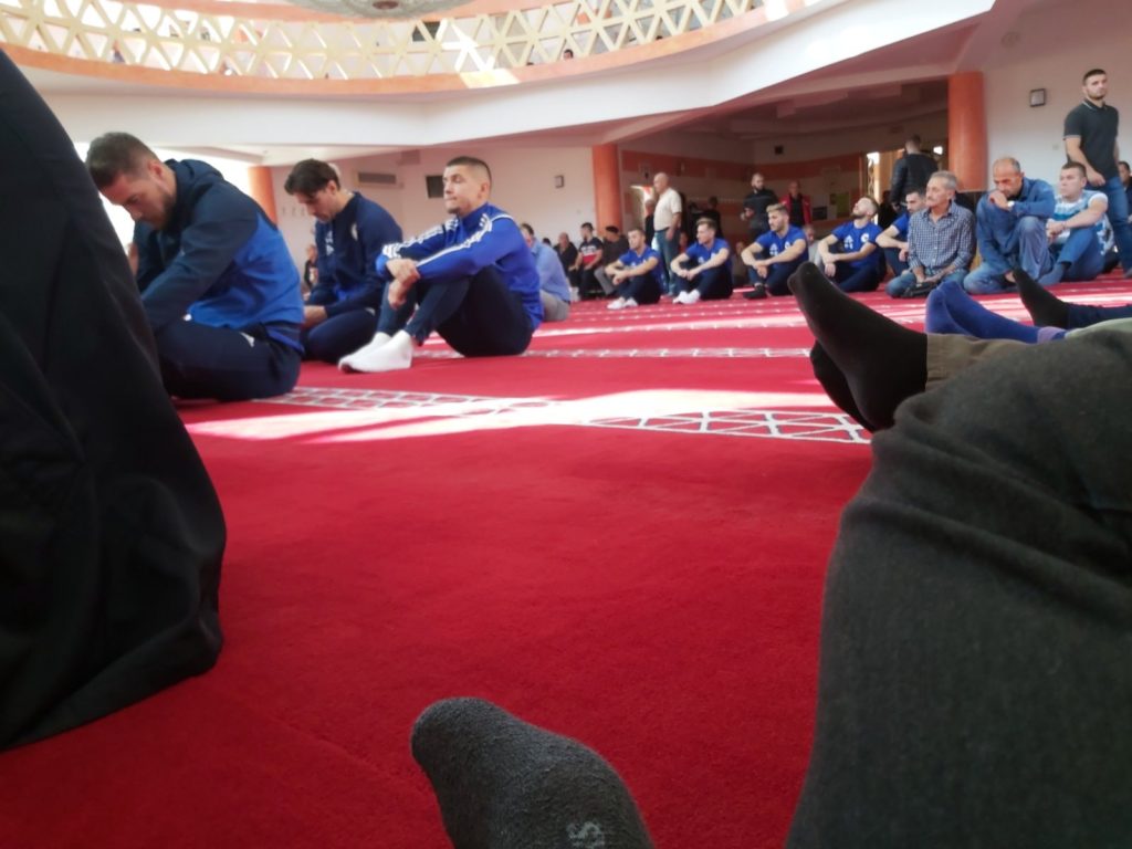 Pred sutrašnju utakmicu Ibrahim Šehić, Muhamed Bešić, Izet Hajrović, Sead Kolašinac, Ervin Zukanović, Edin Višća, trener golmana Kenan Hasagić i Amer Gojak danas su klanjali džuma namaz u zeničkoj Ensar džamiji.