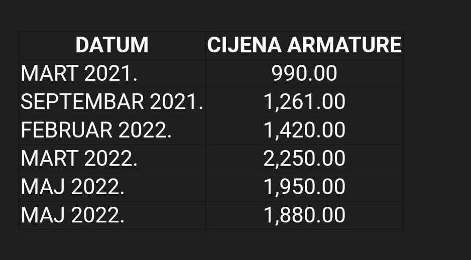 Rast cijena veći je i od zakonski dozvoljenih 20 posto iznosa iznad ugovorenog. Konkretno, cijena armature po kilogramu od marta 2021. godine bilježe značajne promjene. Ovog mjeseca jedna tona armature košta 1.880 KM, što je gotovo duplo skuplje nego u istom periodu prošle godine.