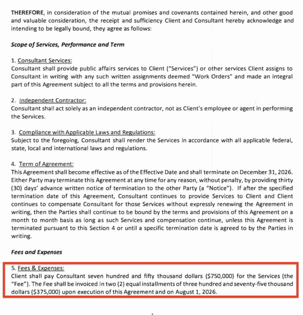 Ugovor od 3,6 miliona dolara kojeg su sklopili s organizacijom Kyiv Global Outreach predviđao je pomoć u “obnovi i održavanju snažne javne podrške Ukrajini” u borbi protiv ruske agresije, te podršku politikama koje jačaju ukrajinsku sigurnost i uslove za mir.