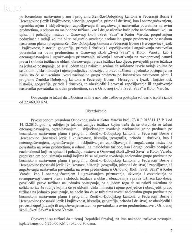 Ovom presudom poništene su sve one sa nižih sudova, pa i ona od Okružnog suda Banja Luka u kojoj su odbijeni zahtjevi roditelja kao neosnovani i naređeno im da plate 8.000 KM sudskih troškova. Vrhovni sud RS je usvojio tužbeni zahtjev, utvrđena je diskriminacija, povreda prava na obrazovanje, jednako postupanje i naloženo je ovoj školi da uvede nacionalne grupe predmeta kao što su Bosanski jezik i književnost, Moja okolina, Priroda i društvo, Geografija i Historija, da se nastava izvodi po bosanskom planu i programu po kojem se radi u Zeničko-dobojskom kantonu i da se na tim predmetima angažuju nastavnici-povratnici.