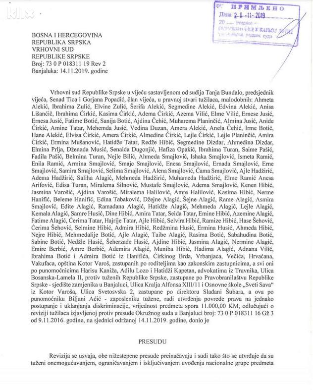 U novembru 2019. godine Vrhovni sud Republike Srpske donio je presudu u kojoj je potpuno uvažio zahtjeve učenika i roditelja Bošnjaka iz mjesta Vrbanjci, a koji su pohađali OŠ Sveti Sava u Kotor Varoši. Ovaj sud je naložio da se uvede nacionalna grupa predmeta i provodi nastava po bosanskom planu i programu.
