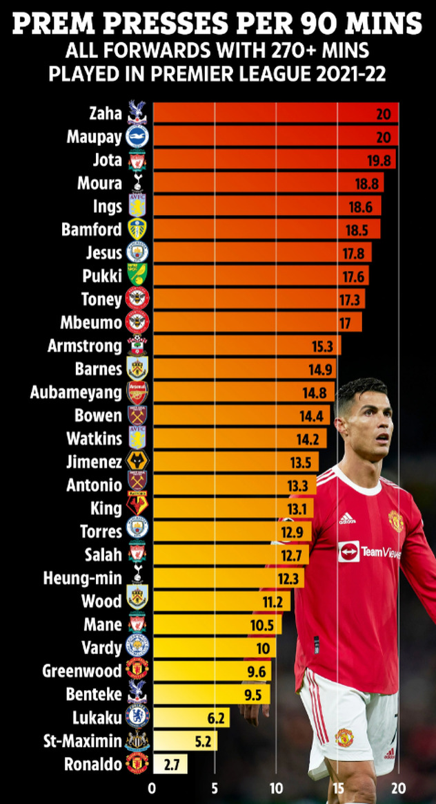 U statističkim podacima koje je otkrio The Athletic, pokazalo se da je Ronaldo u prosjeku vršio samo 2,7 presinga u 90 minuta, što ga čini najgorim po tom parametru u ligi.