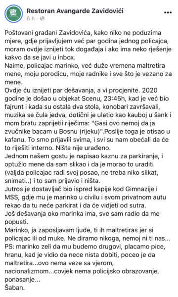 U popodnevnim satima na društvenoj mreži Facebook putem stranice restorana Avangarde u Zavidovićima oglasio se vlasnik restorana.