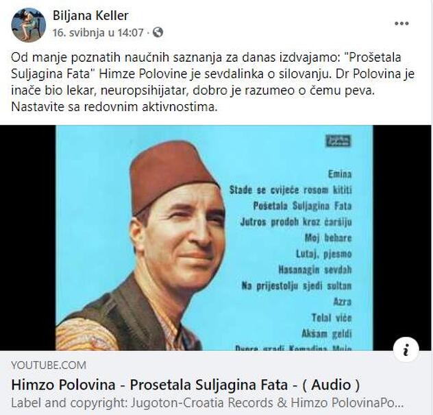 Temu je otvorila srbijanska književnica Biljana Srbljanović koja je na svom Facebook profilu napisala kako sevdalinka “Prošetala Suljagina Fata” veliča silovanje: “Od manje poznatih naučnih saznanja za danas izdvajamo: “Prošetala Suljagina Fata” je sevdalinka o silovanju. Dr Polovina je inače bio lekar, neuropsihijatar, dobro je razumeo o čemu peva. Nastavite sa redovnim aktivnostima”, istakla je nedavno.