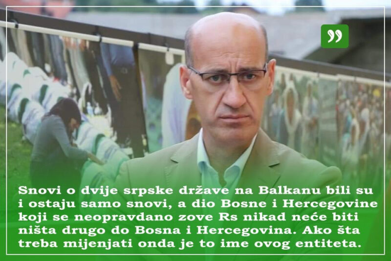 Dodaje kako snovi o dvije srpske države na Balkanu su bili i ostaju samo snovi, a “dio Bosne i Hercegovine koji se neopravdano zove RS nikad neće biti ništa drugo do Bosna i Hercegovina”.