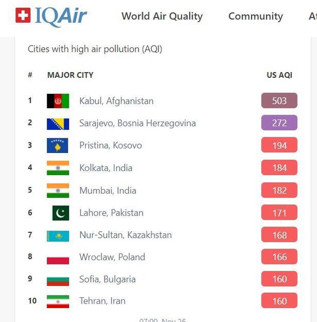 Na prvoj poziciji je Kabul sa indeksom od 503, a odmah na drugom je glavni grad Bosne i Hercegovine.