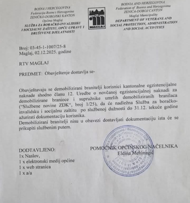 Službe za boračko-invalidsku i socijalnu zaštitu izdale su zvanično obavještenje za demobilizirane borce Zeničko-dobojskog kantona koji su korisnici kantonalne egzistencijalne novčane naknade, a mlađi su od 57 godina i imaju manje od 65 godina starosti, piše 072info.