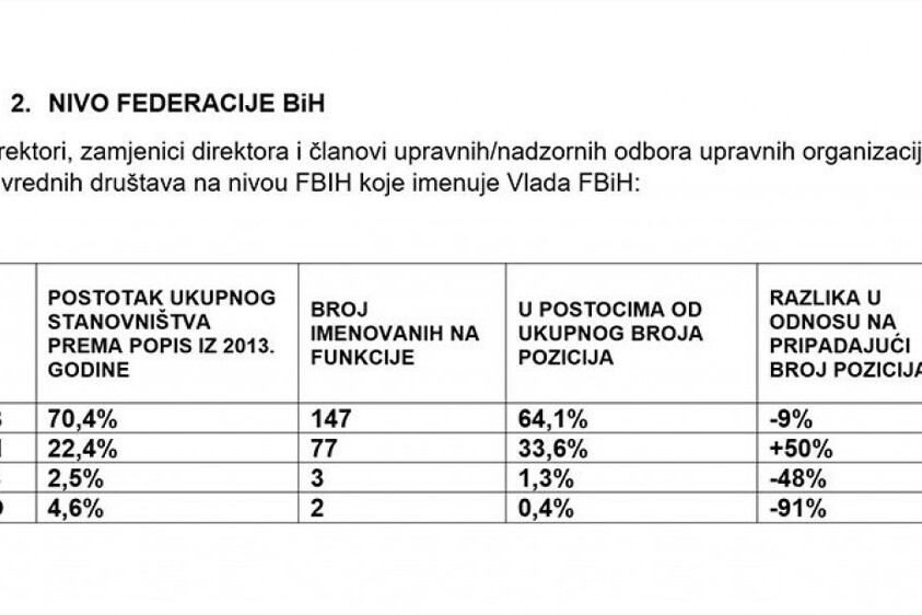 Prema navedenim pokazateljima, Hrvati imaju 50 posto više, a Bošnjaci 9,0 posto manje funkcionerskih pozicija u FBiH u odnosu na broj pozicija koji im pripadaju prema etničkom sastavu stanovništva Federacije Bosne i Hercegovine.