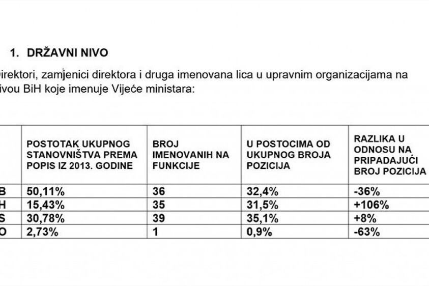 Dakle, Hrvati imaju 106 posto više, a Bošnjaci 36 posto manje pozicija u odnosu na procenat ova dva naroda u ukupnoj etničkoj strukturi naroda Bosne i Hercegovine.