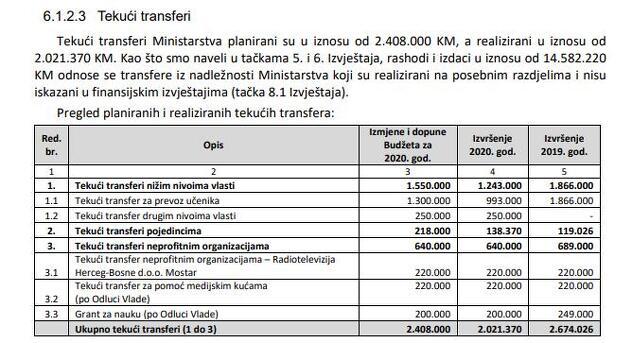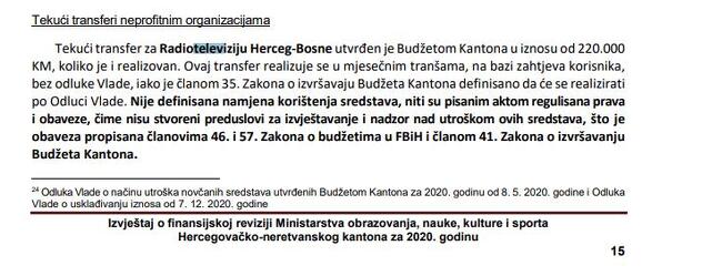 U izvještaju Ureda za revizije institucija u FBiH navodi se kako je tekući transfer za Radioteleviziju Herceg-Bosne utvrđen Budžetom Kantona u iznosu od 220.000 KM, koliko je i realizovan. Revizija navodi da je cijeli transfer mimo zakona, a vidljivo je da je taj iznos bio i u 2019. godini.