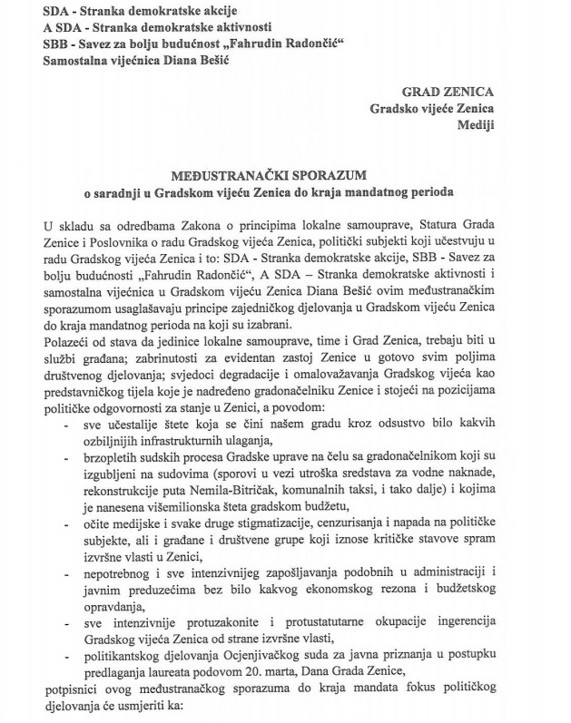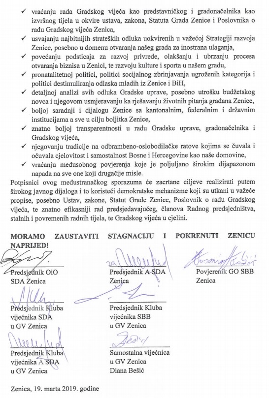 Ovim sporazumom osigurava se većina u Gradskom vijeću Zenica.