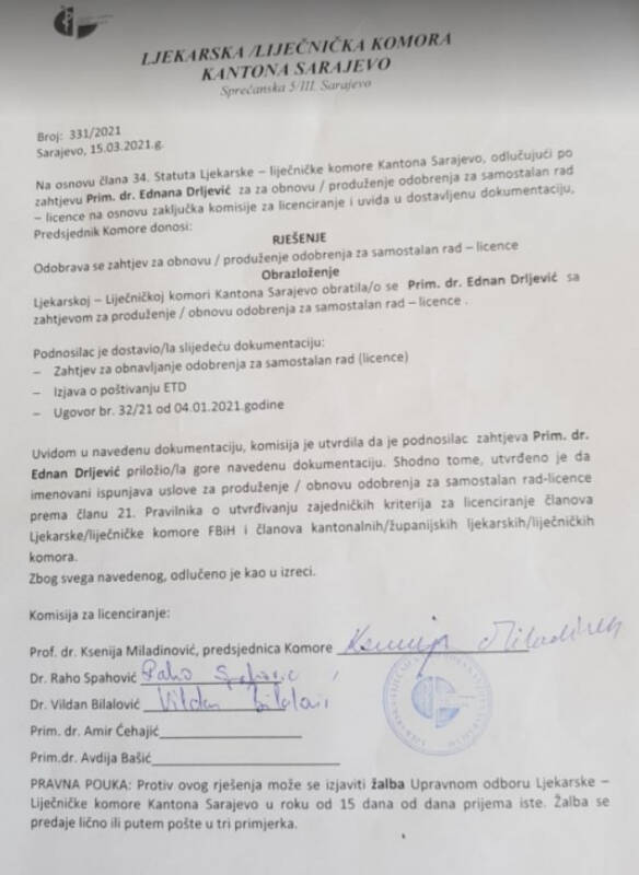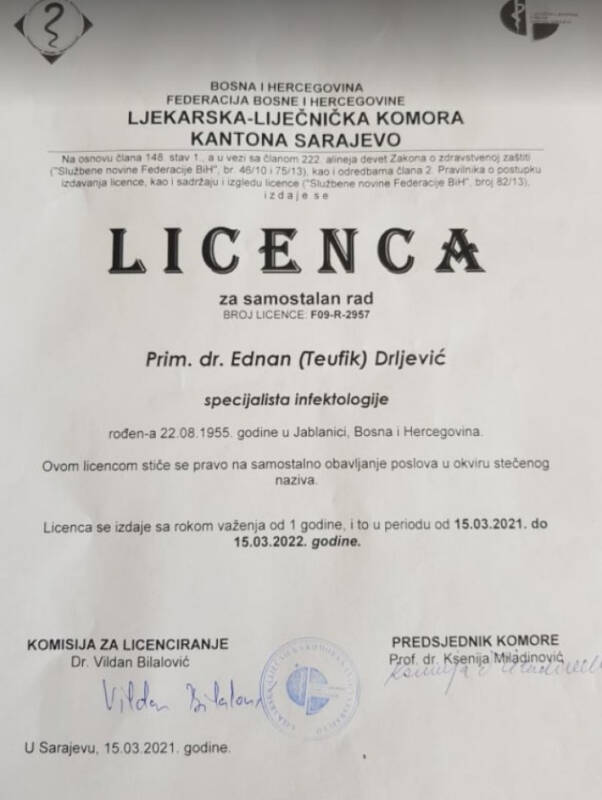 „Avaz“ je došao u posjed dokumenata – licence na kojoj se jasno vidi da je uglednom dr. Drljeviću produžena licenca. Naime, Ljekarska komora Kantona Sarajevo 15. marta 2021. godine produžila je licencu dr. Drljeviću sa rokom važenja od jedne godine, odnosno do 15. marta 2022. godine.