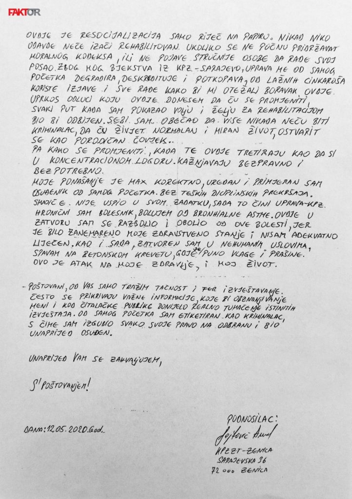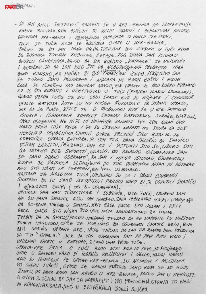 Amel Sejfović, osuđenik koji svoju zatvorsku kaznu izdržava u KPZ-u Zenica, potvrdio je pisanje portala Faktor o tuči koja se u ovoj ustanovi dogodila početkom aprila ove godine.