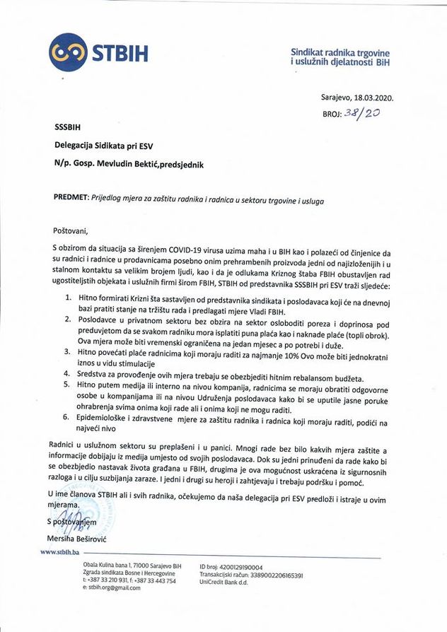“Radnici u uslužnom sektoru su preplašeni i u panici. Mnogi rade bez bilo kakvih mjera zaštite, a informacije dobijaju iz medija umjesto od svojih poslodavaca. Dok su jedni prinuđeni da rade kako bi se obezbijedio nastavak života građana u FBiH, drugima je ova mogućnost uskraćena iz sigurnosnih razloga i u cilju suzbijanja zaraze. I jedni i drugi su heroji i zahtijevaju i trebaju podršku i pomoć. U ime članova STBIH ali i svih radnika, očekujemo da naša delegacija pri ESV predloži i istraje u ovim mjerama”, naveli su iz Sindikata radnika trgovine BiH.