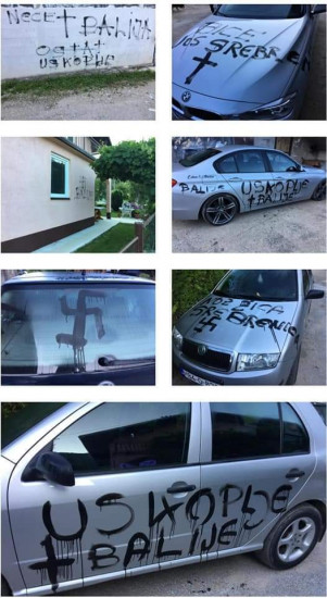 Na jednom od automobila napisano je “Bit će još Srebrenica”, nacrtani su kukasti križevi, a tu je i prijeteća poruka “Neće ostati balija – Uskoplje”. Slučaj je prijavljen policiji.