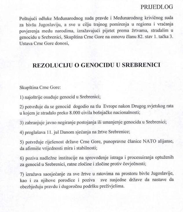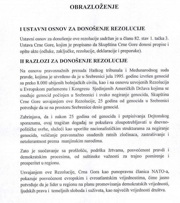 u Evropskom parlamentu i Kongresu Sjedinjenih Američkih Država, kojima se osuđuje genocid počinjen u Srebrenici i svako negiranje genocida, Skupština Crne Gore usvajanjem ove rezolucije, 25 godina od genocida u Srebrenici potvrđuje da se na prostoru Srebrenice desio genocid”, kaže se u obrazloženju prijedloga rezolucije.