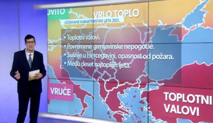 Ako je suditi prema dinamičkim i statističkim izračunima čeka nas jedno uobičajeno ljeto, područje Balkana očekuju povremene, kraće ali i izraženije valove vrućine od kojih barem jedan može nepovoljno utjecati na zdravlje stanovništva. Toplotni valovi, grmljavinske nepogode i opasnost od požara u Hercegovini obilježit će ovo ljeto koje je među 10 toplijih ljeta, kaže Nedim Sladić u svojoj zvaničnoj prognozi za ljeto 2021. godine.