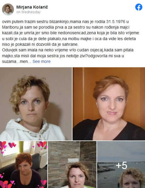 Slovenka Mirjana Kolarič na svom Facebook profilu napisala je da traži sestru blizanku za koju je rečeno da je umrla na rođenju, no ona i njena majka i godinama kasnije sumnjaju u tu priču.