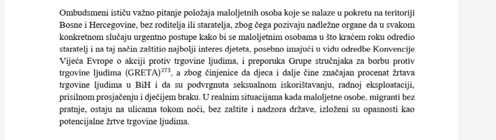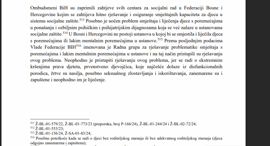 “Posebno je uočen problem smještaja i liječenja djece s poremećajima u ponašanju i ozbiljnim psihičkim i psihijatrijskim dijagnozama koja se već nalaze u ustanovama socijalne zaštite. Neophodno je pristupiti rješavanju ovog problema, jer se radi o ekstremnim kršenjima prava djeteta, prvenstveno djevojčica, koje najčešće dolaze iz disfunkcionalnih porodica, žrtve su nasilja, posebno seksualnog zlostavljanja, iskorištavanja, zanemarene su i zapuštene i neophodno im je liječenje”, navodi se u izvještaju ombudsmena BiH za prošlu godinu.